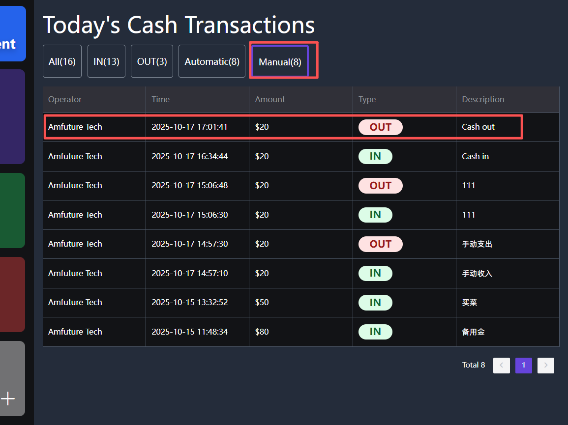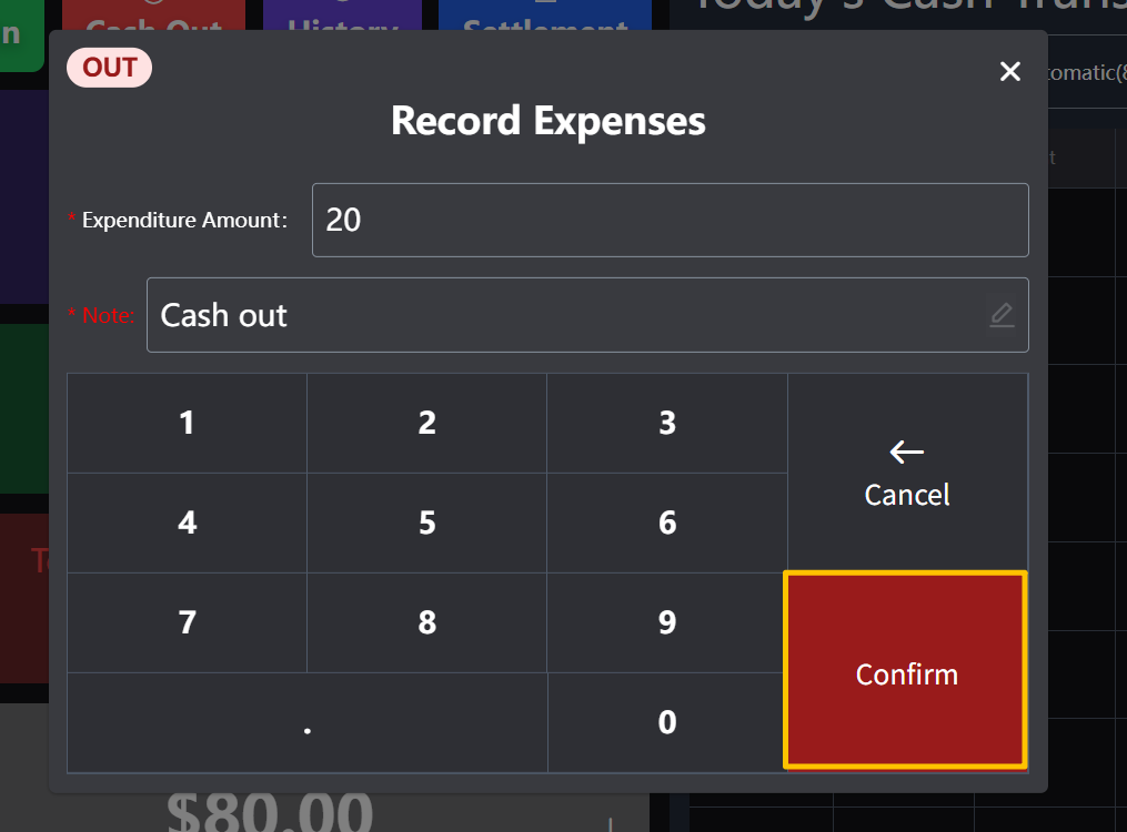 **It is often used for purchasing additional store items with cash and requires manual expenditure from the money box 常用于使用现金进行增购门店物品,需要手动从钱箱中支出的操作** ## Operating procedure 操作流程 ### 1. Click on Cash Out 点击‘支出’  ### 2. on Please enter 输入支出金额  ### 3. Click on Note 点击输入‘备注’ This is a required field 此项为必填项  ### 4. Click on Confirm点击‘确认’ Confirm "Remarks" 确定‘备注’  ### 5.点击‘确认’ Confirm "Add Manual Income 确定‘添加手动支出’  ## After modification, display 修改后展示 在‘今日收支明细’选择‘手动记录’可以查看所有手动操作的记录