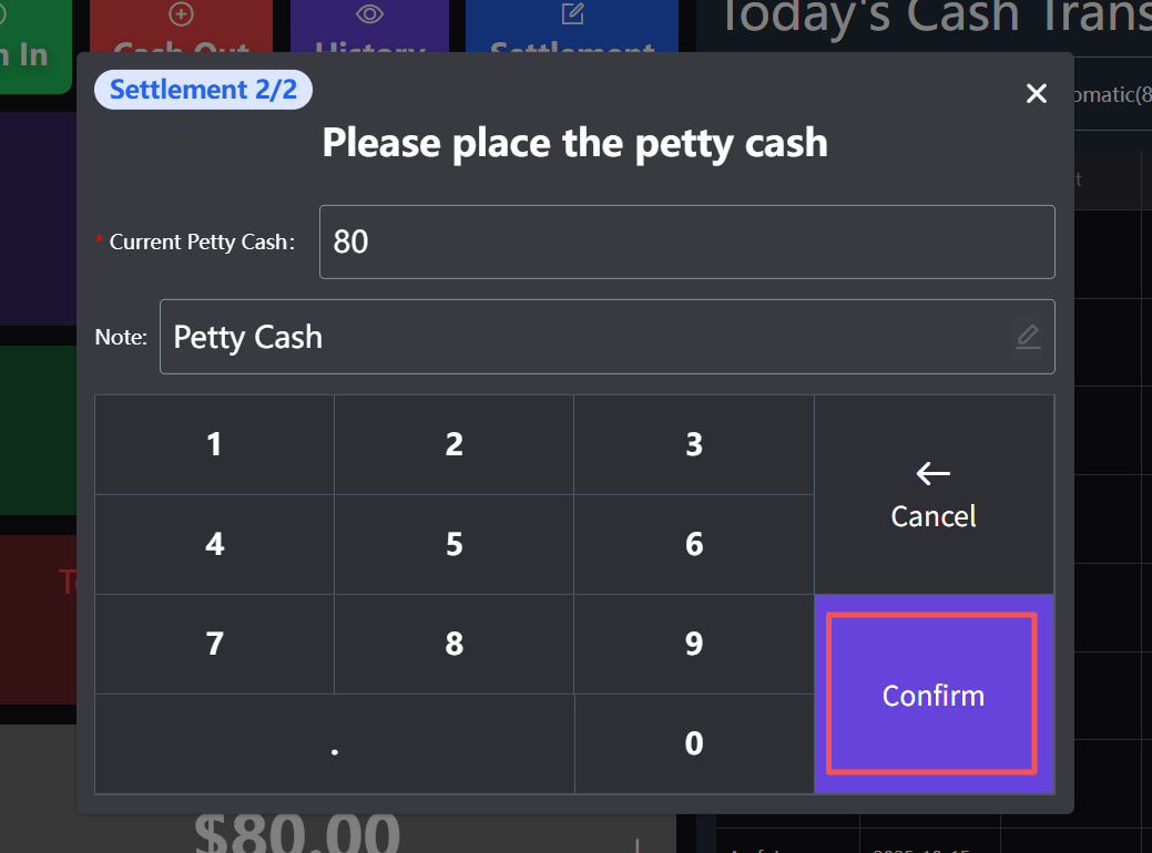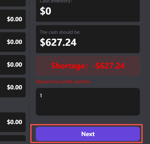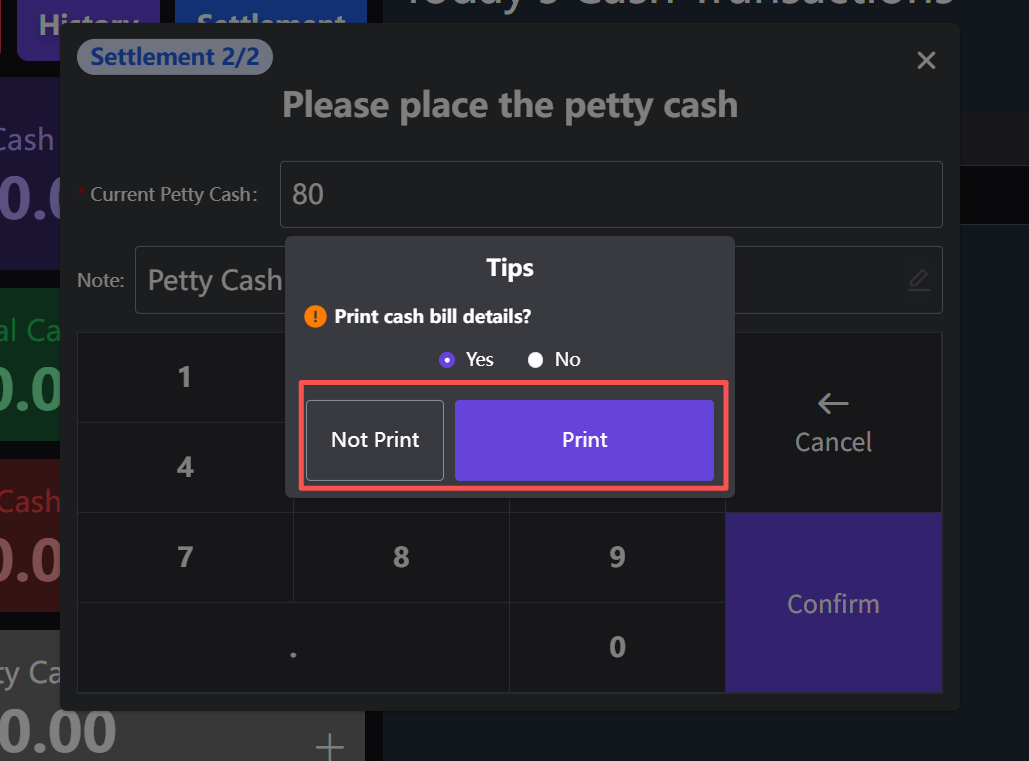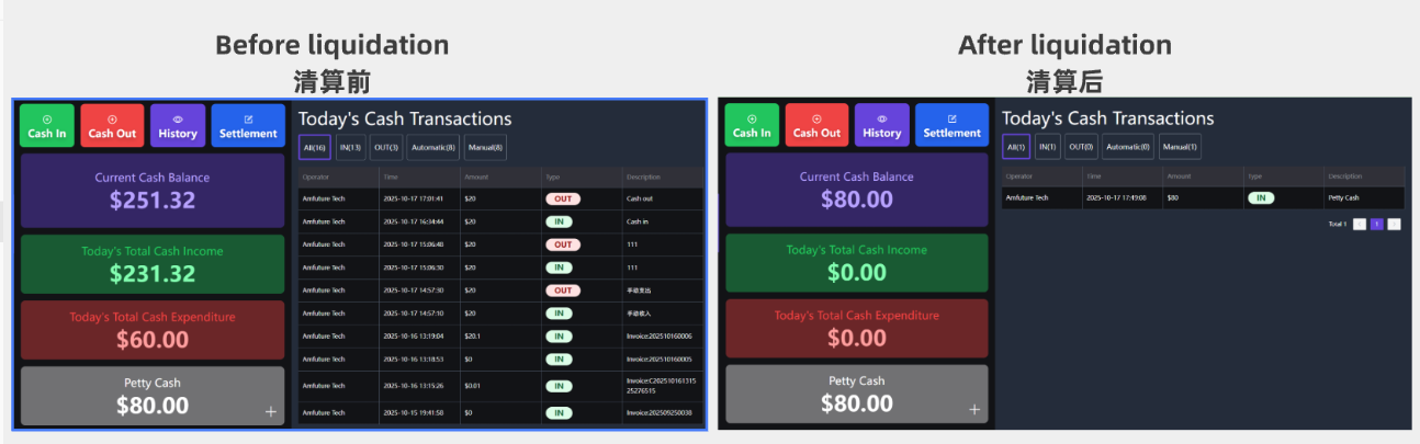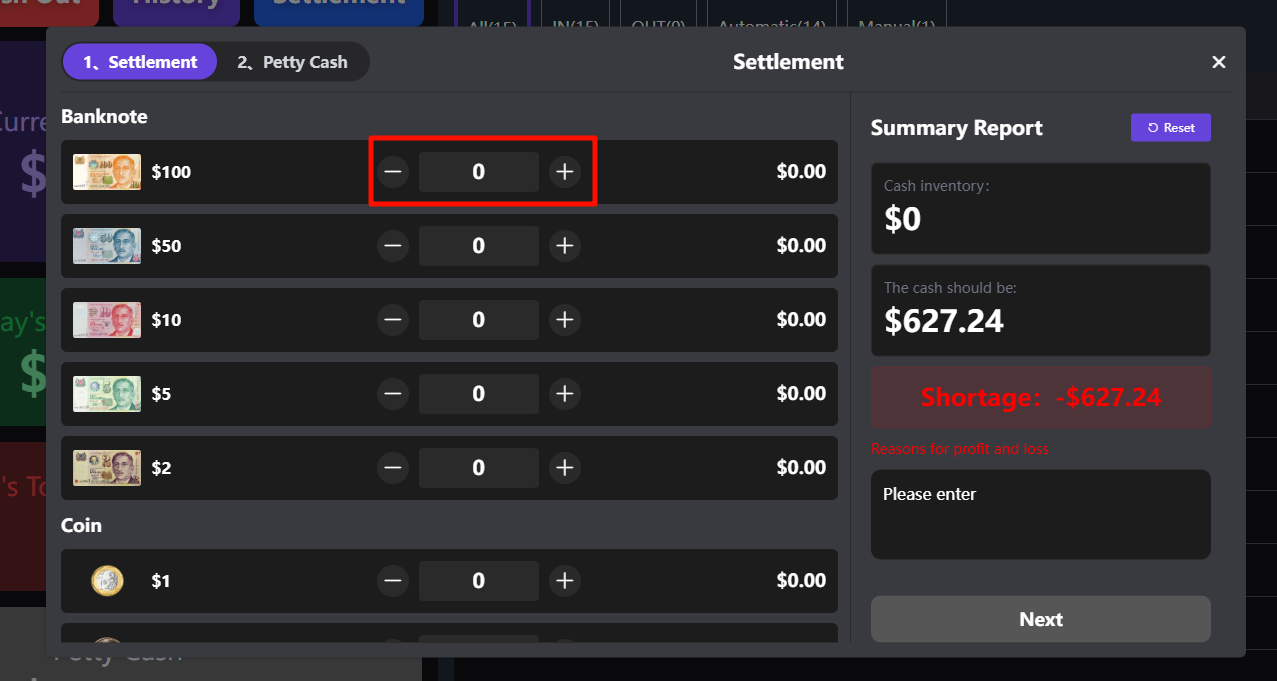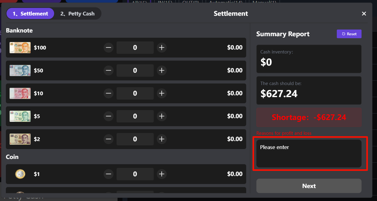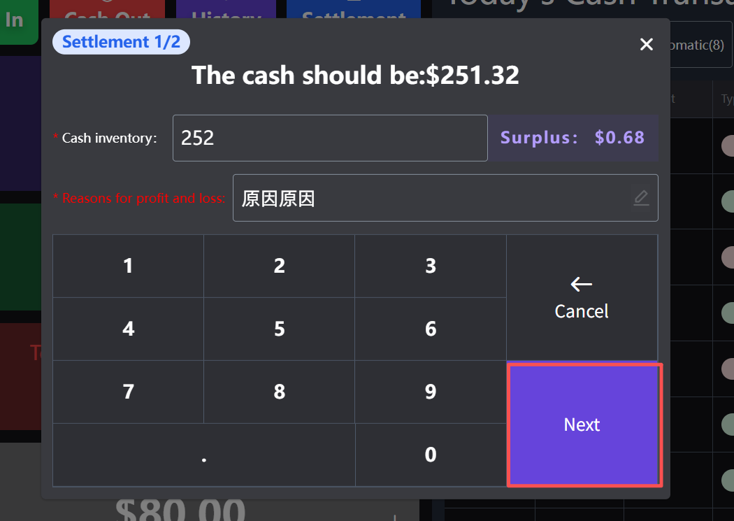 **It is often used for cashiers to quickly count cash receipts and payments as well as the remaining amount during shift changes 常用于收银员交班时可快速清点现金收支及剩余金额的操作** ### Operating procedure 操作流程 ### 1. Click on Settlement 点击‘清算’  ### 2.Manual input 手动输入 #### 1. Enter the amount in the money box 输入钱箱内金额 When you click on "Clearing", a money box will pop up. You need to count the balance in the money box and enter it,==Don't close the cash box for now.== 点击清算时会弹出钱箱,需要清点钱箱内余额,并输入,==暂时不要关闭钱箱==  #### 2. Click on Note 点击备注 .Reasons for profit and loss(This is a required field) 对盈利/亏损进行备注原因(此项为必填项)  #### 3. Click on Confirm 点击确定 Confirm "Remarks" 确定‘备注’  #### 4. Click on Next,点击下一步  #### 5. Enter the reserve funds placed in 输入放入的备用金 Put the cash of the input amount into the money ==And close the money box== 将输入金额的现金,放入钱箱中,==并关闭钱箱==  #### 6.Click on Confirm 点击确定  #### 7.Choose whether you need to print the receipt选择是否需要打印小票 可以选择‘Yes’‘No’记住这次选择  ### 2.Cash Count 现金清点 #### 1.Enter amount of cash and coins 输入现金和硬币数量 You can increase or decrease by clicking '+/-', or you can enter the corresponding cash amount by entering the quantity 可以通过点击‘+/-’进行增加/减少,也可以通过输入数量,进行录入对应现金数额  #### 2.Enter reason for profit and loss输入盈利或亏损原因 Click the input box 点击输入框  Click to enter a profit or loss reason 点击输入盈利或亏损原因  Click 'Confirm' 点击‘确认’  #### 3. Click on Next,点击下一步  #### 4. Enter the reserve funds placed in 输入放入的备用金 Put the cash of the input amount into the money ==And close the money box== 将输入金额的现金,放入钱箱中,==并关闭钱箱==  #### 5.Click on Confirm 点击确定  #### 6.Choose whether you need to print the receipt选择是否需要打印小票 可以选择‘Yes’‘No’记住这次选择  ## Liquidation display 清算展示 After liquidation, all project amounts are reset to zero, leaving only the petty cash 清算后,所有项目金额清零,只留下备用金