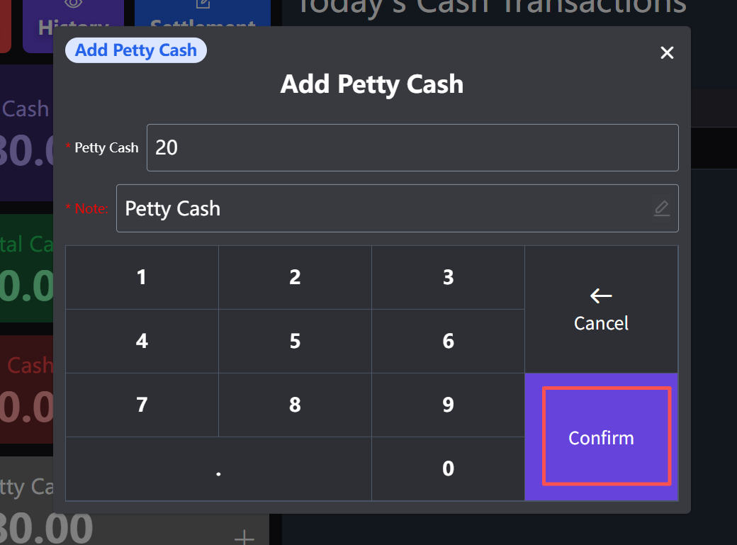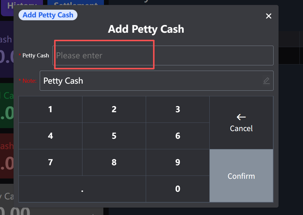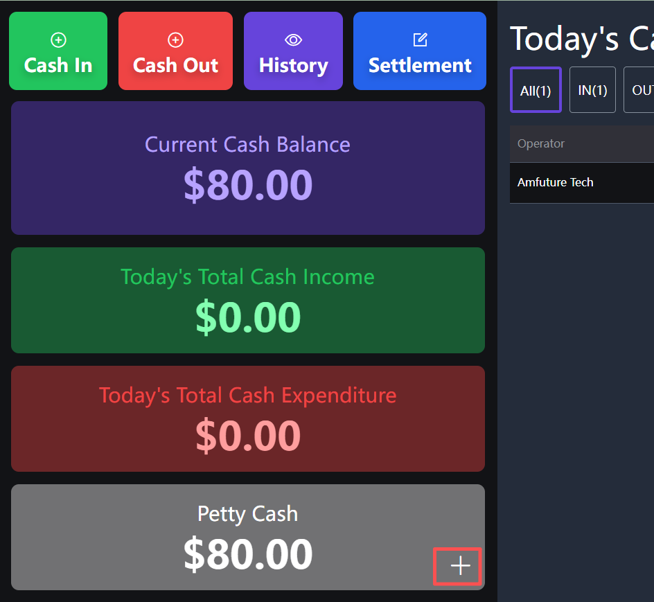 **It is often used in operations that require a temporary increase in reserve funds 常用于需要临时增加备用金的操作** ## Operating procedure 操作流程 ### 1.Click the '+' at the lower right corner of the reserve fund 点击备用金右下角‘+’  ### 2.Enter the amount to be put into the money box 输入放进钱箱的金额  ### 3.Click Confirm 点击确认