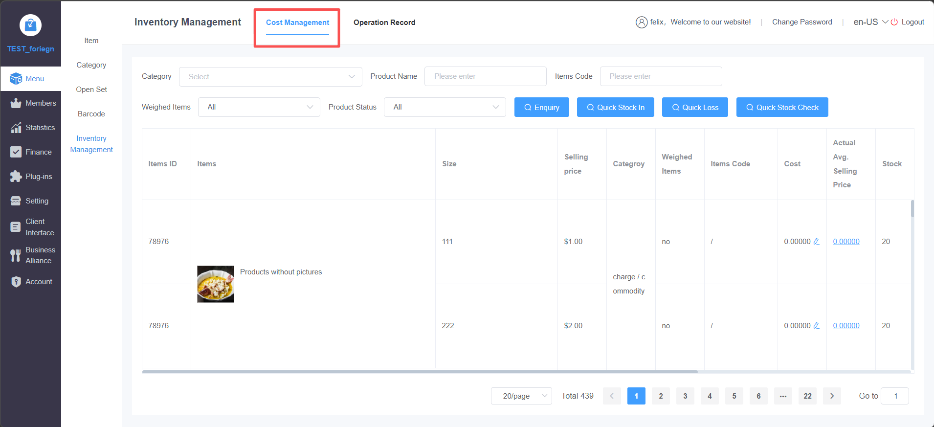 **此篇文档讲解库存从入库、损耗、盘点等操作的使用流程以及注意事项** ## 操作入口 商品-->库存管理-->成本管理