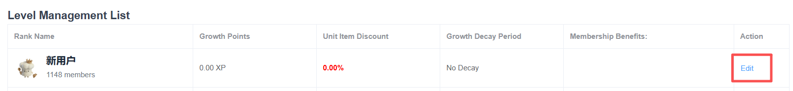 **此篇文档描述新增会员等级的操作步骤** ## 操作流程 ### 1.修改默认等级 在创建时都会有一个名为‘新用户’的默认等级,我们需要将他的等级进行修改  ### 2.选择等级图标 上传/选择不同等级对应的图标(==上传底部为透明,且具有3D效果的图标观感会更好哦~==)  ### 3.设置名称 设置对应等级的名称  ### 4.设置成长值 设置对应等级所需要的成长值(默认等级所需成长值为0,无法调整)  ### 5.设置折扣权益 设置对应等级享受的购买商品的折扣  ### 6.设置消费积分获取倍数 设置对应等级获取消费积分时的倍数(==如果不需要翻倍则填写‘1’==)  ### 7.设置等级位置 设置对应等级的排序位置  ### 8.设置自动升级 设置用户成长值满足后是否自动升级  ### 9.设置消费于成长值比例 设置对应成长值与消费金额的比例  ### 10.设置衰减规则 设置该等级进行衰减时,减少的成长值(减少固定/账户内百分比)  ### 13.设置等级福利 具体教程[设置等级福利](https://wiki.amfuture.ai/doc/240/) ### 12.保存设置 二次检查设置内容后进行保存设置
