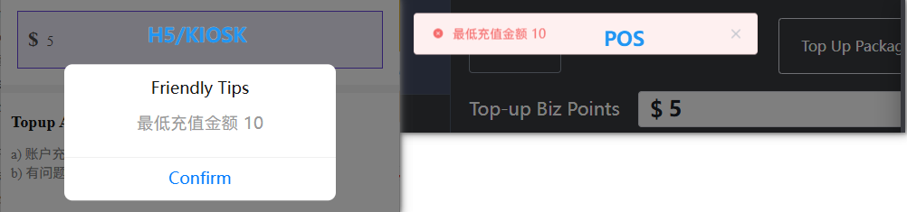 **此文档讲解在商业积分充值的相关操作及核心功能** ## 操作流程 ### 1.选择充值设置  ### 2.客户端充值 开启后,客户端(H5和KIOSK)是否可以充值   ### 3.付款界面充值入口 开启后,收银台会员付款时,是否显示充值入口   ### 4.客户端自定义金额 开启后,客户端(H5和KIOSK)在充值时可以自定义金额充值   ### 5.自定义最低金额 收银台、客户端(H5和KIOSK)在自定义充值时可以充值的最少金额   ### 6.充值时短信验证 开启后,收银台在给客户充值时需要进行短信验证才可进行充值操作(==仅对收银台有效==)   ### 7.使用时短信验证 开启后,收银台使用商业积分支付时会给顾客发送短信OTP进行验证(==仅在收银台有效==)   ### 8.余额变动提醒 开启后,余额使用会发送以下短信提醒   ### 9.充值说明