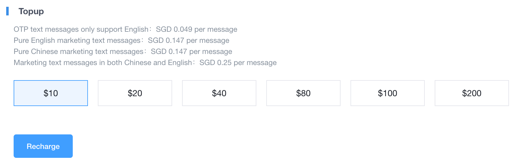 > This page allows merchants to view their current SMS account balance and top up funds to ensure uninterrupted notification and marketing services. > 本页面供商户查看当前的短信账户余额,并进行资金充值以确保通知和营销服务不中断。 --- ### 1. Page Operations & Field Explanations (Top-to-Bottom) 页面操作与字段详解(从上至下) #### Account Balance 账户余额  * **Operation Guide**: View the current available funds in your SMS wallet. * **操作说明**:查看您短信钱包中当前可用的资金。 | Field/Action <br> 字段/操作名称 | Explanation <br> 含义与操作解析 | | :--- | :--- | | **Account Balance** <br> **账户余额** | Displays the remaining monetary value (in SGD) available for sending SMS. <br> 显示当前可用于发送短信的剩余金额(新加坡元)。 | #### Topup 充值  * **Operation Guide**: Review the SMS pricing rates, select a top-up amount, and proceed to pay via mobile QR code scanning. * **操作说明**:查阅短信计费标准,选择充值金额,并通过手机扫码完成支付。 | Field/Action <br> 字段/操作名称 | Explanation <br> 含义与操作解析 | | :--- | :--- | | **Pricing Rates** <br> **计费标准说明** | Details the cost per message in SGD for different categories: OTP (English only), Pure English marketing, Pure Chinese marketing, and Bilingual marketing messages. <br> 详细列出不同类别短信的新加坡元 (SGD) 单条费率:OTP(仅限英文)、纯英文营销、纯中文营销以及中英双语营销短信。 | | **Top-up Amount Options** <br> **充值面额选项** | Predefined values (e.g., $10, $20, $100) to quickly select the desired top-up amount. <br> 预设的金额选项(如 $10、$20、$100),用于快速选择所需的充值额度。 | | **Recharge** <br> **立即充值** | Click to generate a payment QR code. You must use a mobile phone to scan the QR code to complete the payment transaction. <br> 点击生成支付二维码。您必须使用手机扫描该二维码以完成支付交易。 | --- ### 2. Frequently Asked Questions (FAQ) 常见问题 * **Q: Why are there different rates for marketing text messages based on the language?** **Q:为什么营销短信会根据语言有不同的费率?** * **A:** Rates vary due to local telco encoding standards. Bilingual or Chinese messages require Unicode, which reduces the character limit per standard SMS, effectively costing more per message compared to pure English standard encoding. **A:** 费率差异源于本地电信运营商的编码标准。双语或中文短信需要使用 Unicode 编码,这会降低单条标准短信的字符数限制,因此与纯英文标准编码相比,其单条成本更高。 * **Q: What happens if I close the page after clicking "Recharge" but before scanning the QR code?** **Q:如果我点击了“立即充值”,但在扫码前关闭了页面会怎样?** * **A:** The payment will not be processed. You simply need to return to this page, select your top-up amount again, and click "Recharge" to generate a fresh QR code for payment. **A:** 付款将不会被处理。您只需返回此页面,重新选择充值金额并点击“立即充值”,系统会生成一个新的二维码供您支付。