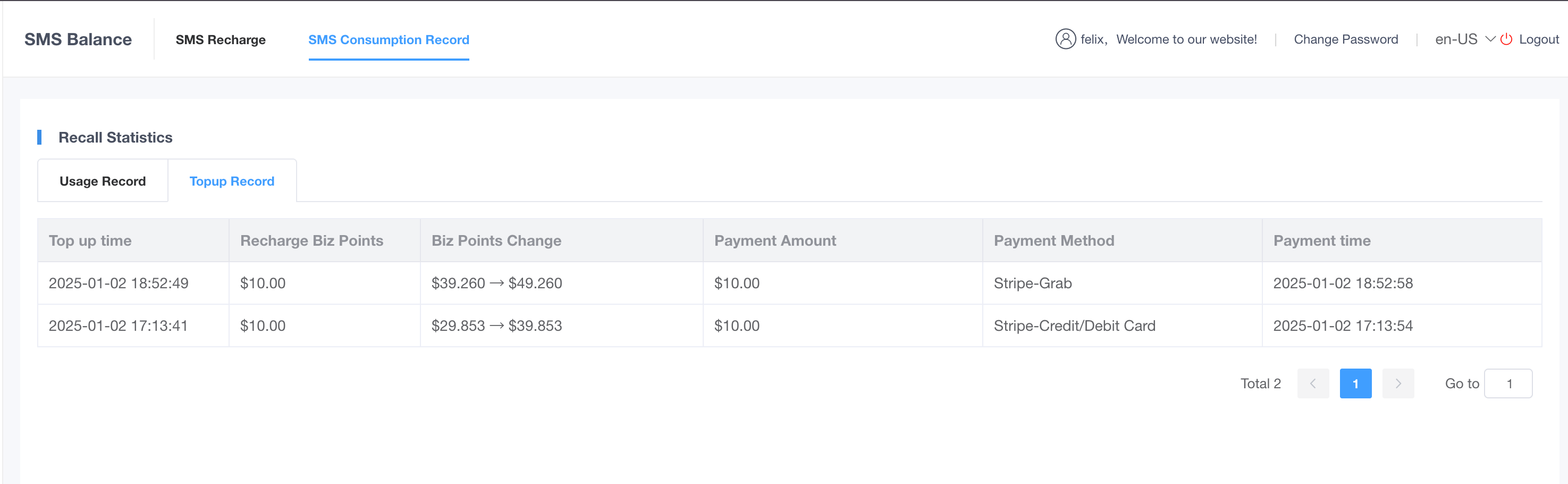 > This page allows merchants to view the historical records of their SMS account top-ups, tracking payment amounts, methods, and balance changes. > 本页面供商户查看其短信账户的充值历史记录,追踪支付金额、支付方式以及余额变动情况。 --- ### 1. Page Operations & Field Explanations (Top-to-Bottom) 页面操作与字段详解(从上至下) #### Topup Record List 充值数据列表  * **Operation Guide**: View detailed logs of each top-up transaction, including the payment method used and the exact time of successful payment. * **操作说明**:查看每笔充值交易的详细日志,包括所使用的支付方式和成功支付的精确时间。 | Field/Action <br> 字段/操作名称 | Explanation <br> 含义与操作解析 | | :--- | :--- | | **Top up time** <br> **充值时间** | The exact date and time when the top-up request was initiated by the merchant. <br> 商户发起充值请求的具体日期和时间。 | | **Recharge Biz Points** <br> **充值商业积分** | The specific top-up value or equivalent business points added to the SMS account. <br> 充入短信账户的具体金额或等值的商业积分。 | | **Biz Points Change** <br> **商业积分变动** | Displays the SMS account balance before and after the top-up transaction (e.g., Before -> After). <br> 显示充值交易前后的短信账户余额对比(如:充值前 -> 充值后)。 | | **Payment Amount** <br> **支付金额** | The actual monetary amount (in SGD) paid for this specific top-up. <br> 此次充值实际支付的金额(新加坡元)。 | | **Payment Method** <br> **支付方式** | The payment gateway or channel used to complete the transaction (e.g., Stripe-Grab, Credit/Debit Card). <br> 完成交易所使用的支付网关或渠道(如 Stripe-Grab、信用卡/借记卡)。 | | **Payment time** <br> **支付时间** | The exact timestamp when the payment was successfully processed and confirmed by the gateway. <br> 支付被网关成功处理并确认的精确时间戳。 | --- ### 2. Frequently Asked Questions (FAQ) 常见问题 * **Q: What exactly does the "Biz Points Change" column represent?** **Q:“商业积分变动”列具体代表什么?** * **A:** It illustrates the transition of your SMS wallet balance. The figure on the left is your balance prior to the top-up, and the figure on the right indicates your new nett balance after the top-up funds have been credited. **A:** 它展示了您短信钱包余额的变动过程。左侧的数字是充值前的余额,右侧的数字是充值资金到账后的最新净余额。 * **Q: Why is there a slight difference between "Top up time" and "Payment time"?** **Q:为什么“充值时间”和“支付时间”之间会存在微小的时间差?** * **A:** "Top up time" records the moment the top-up order was created in the system, whereas "Payment time" logs the exact second the payment provider (e.g., Stripe) successfully cleared the transaction. **A:** “充值时间”记录的是系统中创建充值订单的瞬间,而“支付时间”记录的是支付服务商(如 Stripe)成功结清该笔交易的确切秒数。
