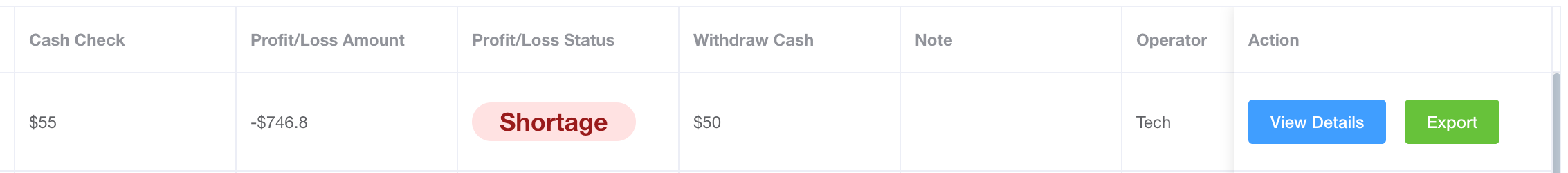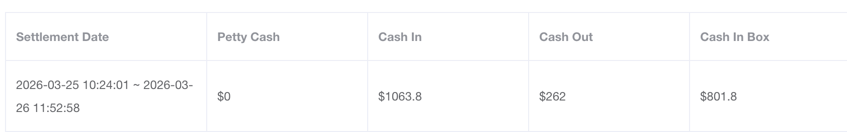 > This section allows merchants to comprehensively manage and track the cash flow of the cash drawer, viewing historical settlement records, reconciliation statuses, and specific cash-in/out details to ensure accurate daily financial auditing. <br> 本节供商户全面管理和追踪收银钱箱的现金流转情况,查看历史班次清算记录、盈亏核对状态以及具体的现金收支明细,以确保每日财务审计的准确性。 #### Filter & Action Area 筛选与操作区  * **Operation Guide**: Select a specific date range to filter and find historical cash drawer settlement records. <br> 选择特定的日期范围以筛选并查找历史钱箱清算记录。 | Field/Action <br> 字段/操作名称 | Explanation <br> 含义与操作解析 | | :--- | :--- | | **Start Date** <br> **开始日期** | Select the beginning date for the log query. <br> 选择日志查询的起始日期。 | | **End Date** <br> **结束日期** | Select the ending date for the log query. <br> 选择日志查询的结束日期。 | | **Search** <br> **搜索** | Click to filter the historical logs based on the selected dates. <br> 点击以根据所选日期过滤历史日志。 | #### Cash Drawer Log List 钱箱日志列表   * **Operation Guide**: Review the summarized cash flow, profit/loss status, and withdrawn amounts for each shift settlement, and perform further actions. <br> 审查每个班次清算的现金流汇总、盈亏状态以及提现金额,并执行进一步操作。 | Field/Action <br> 字段/操作名称 | Explanation <br> 含义与操作解析 | | :--- | :--- | | **Settlement Date** <br> **清算日期** | The start and end timestamps of a specific shift or settlement period. <br> 特定班次或清算期间的开始和结束时间戳。 | | **Petty Cash** <br> **备用金** | The initial float or base cash placed in the drawer at the start of the shift. <br> 班次开始时放入钱箱的初始备用金或底金。 | | **Cash In** <br> **现金收入** | The total amount of cash collected from sales or manual cash-ins during the period. <br> 该期间内从销售或手动存入中收取的现金总额。 | | **Cash Out** <br> **现金支出** | The total amount of cash removed for refunds, expenses, or manual cash-outs. <br> 因退款、支出或手动提取而取出的现金总额。 | | **Cash In Box** <br> **钱箱内现金** | The calculated expected cash remaining in the drawer (Petty Cash + Cash In - Cash Out). <br> 系统计算出的钱箱内应有剩余现金(备用金 + 现金收入 - 现金支出)。 | | **Cash Check** <br> **盘点现金** | The actual physical cash counted and entered by the cashier during settlement. <br> 收银员在清算时实际清点并录入的物理现金。 | | **Profit/Loss Amount** <br> **盈亏金额** | The monetary difference between the actual counted cash and the expected cash. A negative value indicates a cash shortage. <br> 实际清点现金与应有现金之间的差额。负数表示现金短缺(盘亏)。 | | **Profit/Loss Status** <br> **盈亏状态** | Visual indicator of the reconciliation result, displaying either "Surplus" (overage) or "Shortage". <br> 清算核对结果的直观状态指示,显示为“Surplus(盘盈/长款)”或“Shortage(盘亏/短款)”。 | | **Withdraw Cash** <br> **取走现金** | The amount of cash physically removed from the drawer for safe drops or bank deposits at the end of the shift. <br> 班次结束时从钱箱中实际提取,用于投库或存入银行的现金金额。 | | **Note** <br> **备注** | Any manual remarks or explanations added by the operator during the settlement process. <br> 操作员在清算过程中添加的任何手动备注或解释。 | | **Operator** <br> **操作人员** | The name of the staff member who performed the shift settlement. <br> 执行班次清算的员工姓名。 | | **Action: View Details** <br> **操作:查看详情** | Click to open a detailed breakdown of all specific income and expenditure records for this settlement. <br> 点击以打开该次清算中所有具体收支明细的详细列表。 | | **Action: Export** <br> **操作:导出** | Download this specific settlement summary as a spreadsheet. <br> 将此特定的清算汇总下载为电子表格。 | #### Record Details Filter 记录详情筛选区  * **Operation Guide**: After clicking "View Details", use these quick filters to toggle between different types of cash transactions. <br> 点击“查看详情”后,使用这些快捷筛选器在不同类型的现金交易之间切换。 | Field/Action <br> 字段/操作名称 | Explanation <br> 含义与操作解析 | | :--- | :--- | | **whole** <br> **全部** | View all cash transaction records for this settlement. <br> 查看本次清算的所有现金交易记录。 | | **IN** <br> **收入** | Filter to show only cash inflow records. <br> 筛选以仅显示现金流入记录。 | | **OUT** <br> **支出** | Filter to show only cash outflow records. <br> 筛选以仅显示现金流出记录。 | | **Automatic** <br> **自动记录** | Show system-generated records tied to POS transactions (e.g., cash orders). <br> 显示与 POS 交易(如现金订单)绑定的系统自动生成记录。 | | **Manual** <br> **手动记录** | Show records manually added by the operator (e.g., petty cash top-ups). <br> 显示由操作员手动添加的记录(如补充备用金)。 | #### Specific Records List 具体记录明细列表  * **Operation Guide**: Verify individual cash movements, including the operator responsible and the exact reason for the transaction. <br> 核对单笔现金流转,包括负责的操作人员及交易的确切原因。 | Field/Action <br> 字段/操作名称 | Explanation <br> 含义与操作解析 | | :--- | :--- | | **Operator** <br> **操作人员** | The name of the staff member who processed the transaction. <br> 处理该笔交易的员工姓名。 | | **Time** <br> **时间** | The exact timestamp of the cash 