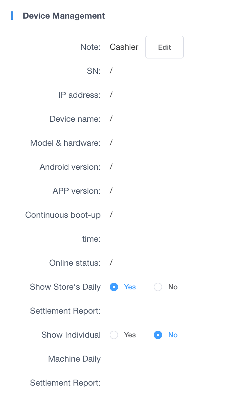 > This tab displays the real-time operational status of each device and provides the necessary tools to authorize and bind new hardware to your store's system. > ==***When the new machine is first installed, it will automatically be bound to the corresponding login account of the original store, and no additional operations are required.***==<br> 本标签页显示每台设备的实时运行状态,并提供授权并将新硬件绑定到门店系统的必要工具。 > ==***新机器首次登陆的机器会自动绑定到对应登录账户本门店下,不用做任何新增操作***== #### Download the software 下载软件 Search for the software name in the system's built-in app store and download it. If you cannot find it, you may download it via [Cashier Terminal Download](https://sgoss.amfuture.cn/download/POS.apk)(not for IMIN devices). <br>通过系统自带的应用商店搜索软件名称,进行下载。如果搜索不到,可以通过[收银端下载](https://sgoss.amfuture.cn/download/POS.apk)(不可用于不可用IMIN的机器) #### Equipment Management 设备管理 * **POS Location (POS 位置)**: These settings apply specifically to the individual physical POS terminal within the store. <br> 这些设置专门应用于在门店中运行的各个具体的物理 POS 终端。 * **POS Effect (前端效果)**: Modifications here directly alter the scope of financial data the staff can view and print when running end-of-day reports on that exact machine. <br> 此处的修改将直接改变员工在该特定机器上运行日结报表时所能查看和打印的财务数据范围。  * **Device Status Monitoring / 设备状态监控 (Read-only)** * **Description (配置含义)**: Provides real-time diagnostic data for the terminal. <br> 提供终端的实时诊断数据。 * **Effect (具体表现)**: Displays the terminal's Serial Number (SN), IP address, Online status, App version, and continuous boot-up time, helping administrators remotely track and troubleshoot hardware issues. <br> 显示终端的序列号 (SN)、IP 地址、在线状态、App 版本和持续开机时间,帮助管理员远程追踪和排查硬件问题。 * **Show Store's Daily Settlement Report / 是否展示本店总日结单** * **Description (配置含义)**: Controls the global reporting view for this specific terminal. <br> 控制该特定终端的全局报表视图。 * **Effect (具体表现)**: If 'Yes', staff running a settlement report on this machine will see the consolidated sales data for the entire store, including transactions from all other connected cashiers and mobile ordering channels. <br> 如果选“是”,员工在这台机器上执行日结报表时,将看到整个门店(包含来自所有其他互联收银机和移动点餐渠道的交易)的汇总销售数据。 * **Show Individual Machine Daily Settlement Report / 是否展示单机日结单** * **Description (配置含义)**: Controls the local reporting view for this specific terminal. <br> 控制该特定终端的局部报表视图。 * **Effect (具体表现)**: If 'Yes', staff can generate a localized report showing *only* the transactions processed through this exact physical device. This is essential for cashiers to balance their individual cash drawers at the end of a shift. <br> 如果选“是”,员工可以生成仅包含通过*这台特定物理设备*处理的交易的局部报表。这对于收银员在班次结束时核对各自的钱箱至关重要。 * **Device Type / 设备类型** * **Description (配置含义)**: Specifies the operational role of the new hardware. <br> 指定新硬件的业务角色。 * **Effect (具体表现)**: Choose "Cashier" for a main terminal (typically handling payments and cash drawers) <br> 选择“Cashier (收银机)”作为主终端(通常处理支付和钱箱) * **SN (Serial Number) / SN (序列号)** * **Description (配置含义)**: The method used to authenticate and connect the physical device to the system. <br> 用于验证并将物理设备连接到系统的鉴权方式。 * **Effect (具体表现)**: * **If "Cashier" is selected**: You must manually input the exact physical SN (Serial Number) printed on the hardware device. <br> **如果选择“Cashier”**:您必须手动输入硬件设备机身上打印的确切物理 SN 码。 * **Device name / 设备名称** * **Description (配置含义)**: A custom, recognizable label for the machine. <br> 为机器自定义的易于识别的标签。 * **Effect (具体表现)**: This name (e.g., "Main Counter" ) will appear on printed receipts, in transaction logs, and within backend reports, making it easy to track operations back to a specific physical device. <br> 该名称(例如“主收银台”)将出现在打印的小票、交易日志和后台报表中,从而轻松将操作追踪到特定的物理设备。 ### 2. Frequently Asked Questions (FAQ) 常见问题 * **Q: Can I enable both the Store's Daily Report and the Individual Machine Report on the same device?** **Q:我可以在同一台设备上同时启用本店总日结单和单机日结单吗?** * **A:** Yes. If both are toggled to "Yes", the cashier will have the option to choose which type of settlement report they want to view or print when they close their shift on that POS terminal. <br> **A**:可以。如果两者都切换为“是”,当收银员在该 POS 终端上进行交接班时,系统会提供选项,让他们选择要查看或打印哪种类型的清算报表。 * **Q: Why is the newly added device showing as offline?** **Q:为什么新添加的设备显示为离线状态?** * **A:** A device will show as offline if it is turned off, disconnected from the internet, or if the POS application has not been successfully logged in using the authorized SN yet. Please ensure the hardware is powered on and connected to the Wi-Fi. <br> **A**:如果设备已关机、未连接到互联网,或者尚未通过已授权的 SN 成功登录 POS 应用程序,它将显示为