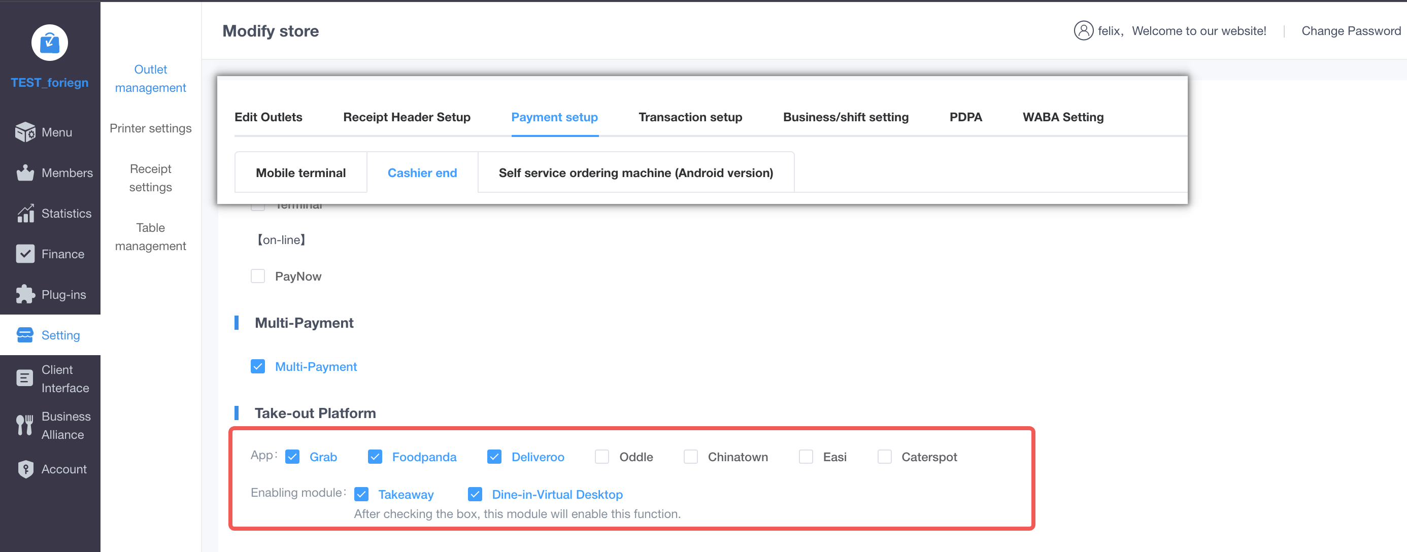 > This section explains how to manually process and record orders from non-integrated delivery platforms on your POS terminal, ensuring correct reporting and kitchen synchronization. <br> 本节说明如何在 POS 收银终端上手动处理和记录未系统对接的外卖平台订单,以确保报表准确及后厨同步。 1. **Enable Platform Settings**: Go to Backend -> Store -> Settings -> Payment Settings -> POS Terminal. Select and enable the specific delivery platforms you need to accommodate. <br> 1. **开启平台设置**:进入后台 -> 门店 -> 设置 -> 支付设置 -> 收银端,选择并开启您需要支持的特定外卖平台订单选项。  2. **Process on POS**: After completing a Place an order workflow on the POS terminal, select the corresponding delivery platform and input the specific external Order ID to finalize the checkout. <br> 2. **收银端结账**:在收银台完成正常的下单工作流后,选择对应的外卖平台,并手动输入具体的外部订单编号以完成结账。  3. **Kitchen Sync**: Once processed, the assigned delivery platform's name and the entered Order ID will be automatically displayed on the Kitchen Display System (KDS) and the printed kitchen tickets to notify the chefs. <br> 3. **后厨同步**:处理完成后,对应的外卖平台名称和输入的订单编号将自动同步显示在厨房 KDS 和打印的后厨小票上,以通知厨师。