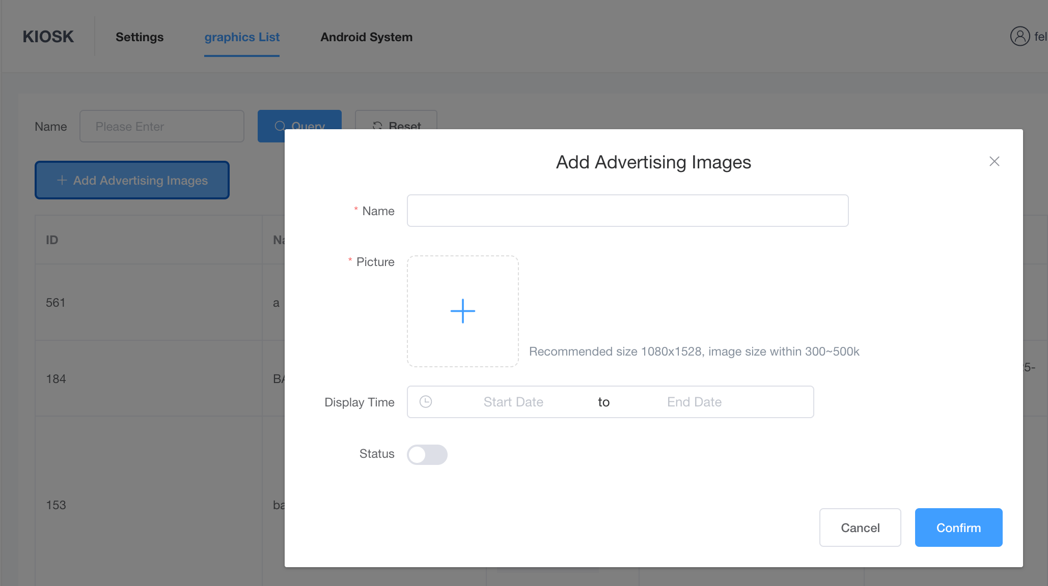 > This tab is used to manage the standby advertising screensavers for the KIOSK terminal, allowing merchants to display promotions and attract passing customers. <br> 本标签页用于管理 KIOSK(自助点餐机)的待机广告轮播图,允许商户展示促销信息以吸引路过的顾客。 #### graphics List 广告图列表 * **POS Location (POS 位置)**: The full-screen standby interface (screensaver) on the KIOSK terminal when no user is interacting with it. <br> KIOSK 自助点餐机处于无人操作闲置状态时的全屏待机界面(屏幕保护程序)。 * **POS Effect (前端效果)**: Promotional posters added and enabled here will automatically loop on the idle KIOSK screen, serving as a digital billboard to prompt customers to tap and start their order. <br> 在此处添加并启用的促销海报将在闲置的 KIOSK 屏幕上自动循环播放,充当数字广告牌,提示顾客点击屏幕开始点餐。  * **Add Advertising Images / 添加广告图**  * **Description (配置含义)**: Uploads a new promotional poster to the Kiosk's advertising rotation list. <br> 上传新的促销海报到 KIOSK 的广告轮播列表中。 * **Effect (具体表现)**: Once uploaded and saved, the image file is pushed to the physical terminal. To ensure a high-definition display without causing the Kiosk application to lag or crash, it is highly recommended to strictly follow the UI guidelines: a vertical resolution of 1080x1528 and a file size between 300~500k. <br> 上传并保存后,图像文件将被推送到物理终端。为了确保高清显示且不会导致 KIOSK 应用程序卡顿或崩溃,强烈建议严格遵循 UI 指南:使用 1080x1528 的竖屏分辨率,且文件大小控制在 300~500k 之间。 * **Display Time / 展示时间** * **Description (配置含义)**: Schedules the specific active date range (Start Date to End Date) for the advertisement. <br> 为广告设定具体的生效日期范围(开始日期至结束日期)。 * **Effect (具体表现)**: The Kiosk system will read this schedule and *only* include this image in its screensaver loop during the configured period. Once the End Date passes, the poster is automatically removed from the active rotation on the Kiosk, saving merchants from manual unpublishing after a promotion ends. <br> KIOSK 系统会读取此排期,且*仅在*配置的时间段内将此图片纳入待机轮播。一旦超过结束日期,该海报将自动从 KIOSK 的有效轮播中移除,免去了商户在促销结束后手动下架的麻烦。 * **Status / 状态** * **Description (配置含义)**: Manually toggles the immediate visibility of the individual poster on the Kiosk. <br> 手动切换单张海报在 KIOSK 上的即时可见性。 * **Effect (具体表现)**: If toggled off (gray), the image is instantly hidden from the Kiosk screensaver, overriding the "Display Time" setting. The image data remains saved in the backend list, allowing the merchant to quickly re-enable it for future use. <br> 如果切换为关闭(灰色),无论“展示时间”如何设置,该图片都会立即从 KIOSK 待机屏幕中隐藏。图像数据仍保存在后台列表中,允许商户快速重新启用以供将来使用。 --- ### 2. Frequently Asked Questions (FAQ) 常见问题 * **Q: Why is my newly added advertising image not showing up on the KIOSK screen?** **Q:为什么我新添加的广告图没有在 KIOSK 屏幕上显示?** * **A:** Please verify the following three points: 1. Is the "Status" toggle switched to the ON position (blue)? 2. Is today's date within the configured "Display Time" window? 3. Have you waited a few minutes or restarted the KIOSK application to allow the new image files to fully download from the cloud? <br> **A**:请核实以下三点:1. “状态”开关是否已切换至开启位置(蓝色)?2. 今天的日期是否在配置的“展示时间”窗口内?3. 您是否等待了几分钟或重启了 KIOSK 应用程序,以允许新图像文件从云端完全下载?
