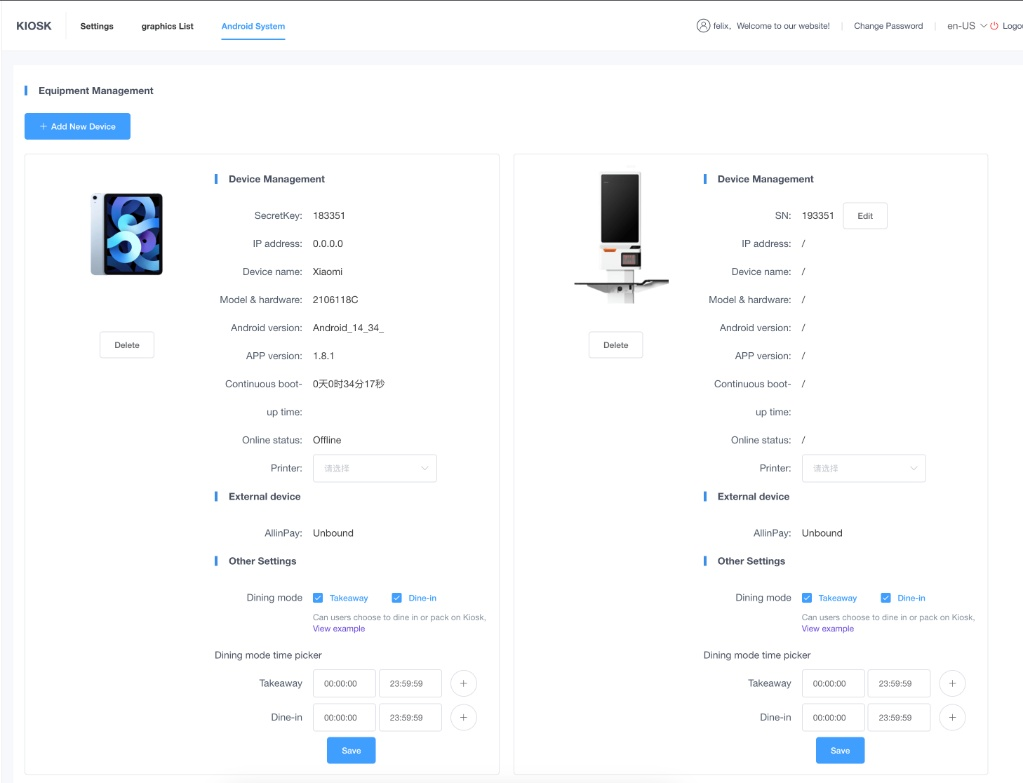 > This tab focuses on device lifecycle management, from app installation and hardware binding to specific dining mode and operating hour configurations. <br> 本标签页专注于设备的生命周期管理,从应用程序的安装下载、硬件绑定到具体的就餐模式与营业时段配置。 #### Equipment Management 设备管理  * **POS Location (POS 位置)**: The self-service ordering application installed on the physical KIOSK machine or Pad, and its associated backend profile. <br> 指安装在物理 KIOSK 机器或 Pad 上的自助点餐应用程序及其关联的后台档案。 * **POS Effect (前端效果)**: Configurations here determine whether the device can connect to the network, which printer it uses, and which dining modes are displayed to customers on the interface. <br> 此处的配置决定了该台设备能否成功联网、连接哪台打印机,以及在界面上向顾客展示何种就餐方式。 * **Add New Device / 添加设备** * **Description (配置含义)**: The critical step to authorize and bind the physical hardware to the cloud system. <br> 将物理机具授权并绑定到云端系统的关键步骤。 * **Effect (具体表现)**: * **For KIOSK**: The physical Serial Number (SN) of the machine must be entered for binding. It is recommended to download the KIOSK app from the App Store; if unavailable, use the provided download link. <br> **KISOK 类型**:必须输入机身的物理序列号(SN)进行绑定。安装时建议优先从应用商店下载 KIOSK 应用;如商店内搜索不到,可使用系统提供的下载链接。 * **For Pad**: No SN is required; the system generates a **SecretKey** upon confirmation. The Pad app must be downloaded via a dedicated link, and the key is entered after installation to complete binding. <br> **Pad 类型**:无需 SN,点击确认后系统会生成 **SecretKey (密钥)**。Pad 应用需通过专属链接下载,安装后输入该密钥即可完成绑定。  * **Printer & External device / 打印机与外接设备** * **Description (配置含义)**: Assigns external hardware to a specific terminal. <br> 为特定终端指定外接硬件。 * **Effect (具体表现)**: After selecting an associated printer here, orders from this machine will only print from the specified printer. It also monitors the binding status of third-party payment terminals like AllinPay. <br> 在此处选择关联的打印机后,该台机器处理的订单将仅从指定的打印机出单。同时可监控 AllinPay 等第三方刷卡机具的绑定状态。  * **Dining mode / 就餐模式** * **Description (配置含义)**: Controls the first selection step after the KIOSK welcome screen. <br> 控制 KIOSK 欢迎页后的首个选择步骤。 * **Effect (具体表现)**: If both "Takeaway" and "Dine-in" are checked, customers must select a mode before ordering. If only one is checked, the system skips the selection screen and enters the menu directly in that mode, improving efficiency for single-purpose machines. <br> 若同时勾选“打包”与“堂食”,顾客点击开始后必须先选择其中一种模式。若仅勾选其中一项,系统将自动跳过选择步骤,直接以该模式进入菜单页,提高特定场景机具的点餐效率。   * **Dining mode time picker / 就餐模式时间段配置** * **Description (配置含义)**: Automatically controls the visibility of dining modes based on specific time periods. <br> 按时间段自动控制就餐模式的可见性。 * **Effect (具体表现)**: Different available times can be set for Takeaway and Dine-in. For example, if Dine-in is set to end at 22:00, the KIOSK screen will automatically hide the "Dine-in" option after 10 PM, forcing customers to select "Takeaway." <br> 可为“打包”和“堂食”设定不同的可用时间。例如,设定堂食于 22:00 结束,超过晚上 10 点后,KIOSK 屏幕将自动隐藏“堂食”选项,强制顾客只能选择“打包”。  --- ### 2. Frequently Asked Questions (FAQ) 常见问题 * **Q: After installing the KIOSK app, why does the screen ask for a "SecretKey" instead of an SN?** <br> **Q:安装 KIOSK 应用后,为什么屏幕要求输入“密钥 (SecretKey)”而不是 SN 码?** * **A:** Due to hardware variations, the KIOSK app on certain device models may trigger the SecretKey authentication logic. In this case, please simply create a **"Pad"** device entry in the backend and use the generated SecretKey to log in. <br> **A**:由于硬件机型的差异,部分设备运行 KIOSK 应用时可能会触发密钥验证逻辑。若遇到此情况,请直接在后台创建一个 **“Pad”** 类型的设备,并使用生成的密钥登录即可。 * **Q: Where can I get the download link if I can't find the app in the Store?** <br> **Q:如果在商店找不到应用,从哪里获取下载链接?** * **A:** Please contact our support team or check the system notification area for the latest download URL. Both KIOSK and Pad applications can be installed via the link if the App Store is unavailable.[Click to Download](https://sgoss.amfuture.cn/download/app.apk) <br> **A**:请联系技术支持团队或查看系统公告区域以获取最新的下载链接。若应用商店不可用,KIOSK 和 Pad 应用均可通过系统提供的链接进行安装下载。[点击下载](https://sgoss.amfuture.cn/download/app.apk)