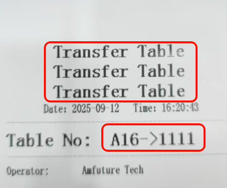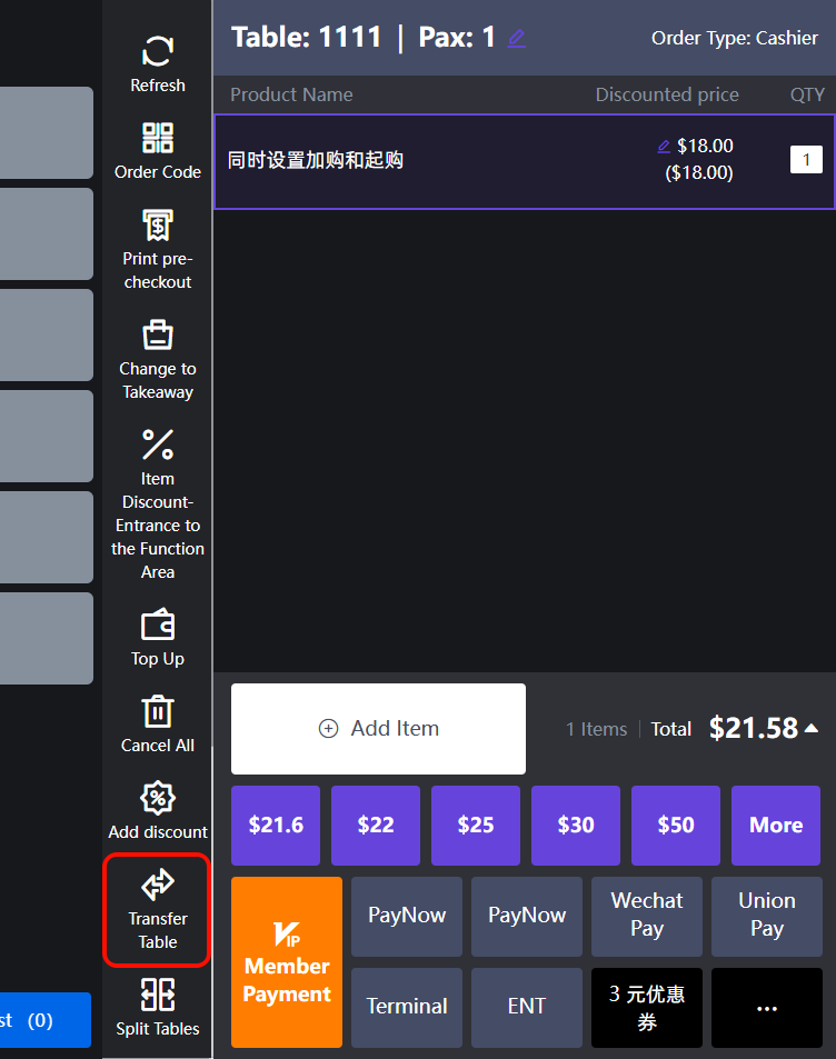 **Transfer orders to other tables to meet the needs of customers changing tables, etc., if you open the Takeaway virtual table, you can transfer the entire dine-in table order to dine-in 将订单转移到其他桌台,以适应顾客换桌等需求,如果打开了Takeaway虚拟桌台,可以把整个堂食的桌子订单转台到堂食** ## Operation process 操作流程 Select the table you ordered, click the 'Turntable' button, select the table you need to go to, click 'Confirm', and the transfer is successful 选择好下单好的桌台,点击‘转台’按钮,选择需要转到的桌台,点击‘确认’,转台成功   ## Turntable display 转台展示 **After the turntable, check out according to the table behind the turntable** 1.Product display, normal display of the goods of the turntable 2. Checkout receipt and display the normal receipt 3. The kitchen and running hall will print a notice of turntable receipts **转台后,按照转台后桌台结账** 1.商品展示,正常展示转台的商品 2.结账小票,展示正常小票收据 3.厨房和跑堂会打印转台小票通知
