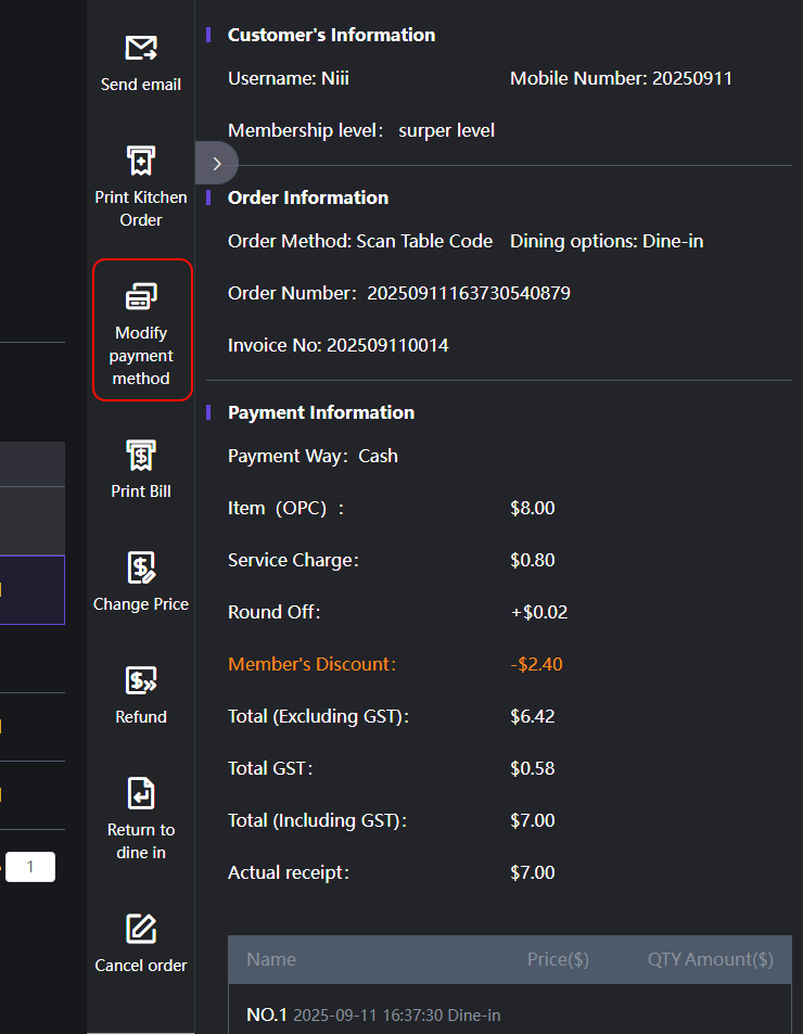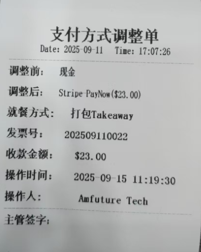 **It is allowed to modify the payment method after the order is settled, such as changing from cash payment to bank card payment, etc., but the third-party payment type currently only supports technical ticket processing 允许在订单结算后修改支付的方式,如从现金支付改为银行卡支付等,但三方支付类型目前只支持技术工单处理** ## Operation process 操作流程 Select the order, click 'Modify Payment Method' to select the changed payment method, and click 'Confirm' to successfully modify it 选择订单,点击‘修改支付方式’选择更改后的支付方式,点击‘确认’修改成功   ## Modify the display 修改展示 1.After the modification is successful, the 'Payment Method Adjustment Form' receipt will be printed 2.On the daily statement, only the adjusted payment method will be displayed 1.修改成功后,会打印‘支付方式调整单’小票 2.在日结单,只显示调整后的付款方式