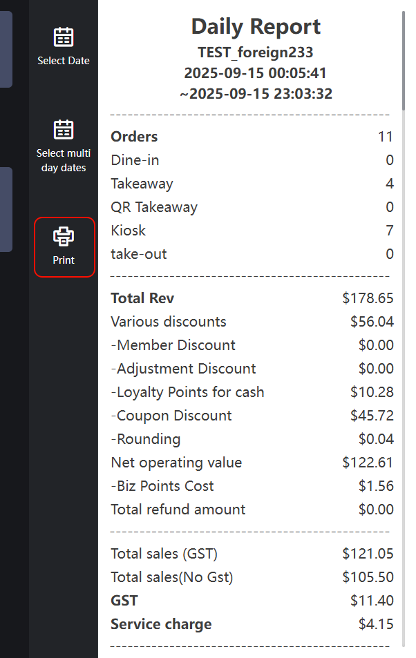 4.1.5 Print Kitchen Order/Print Bill 再次厨打/打印小票