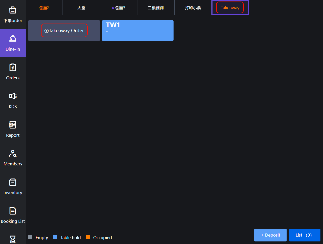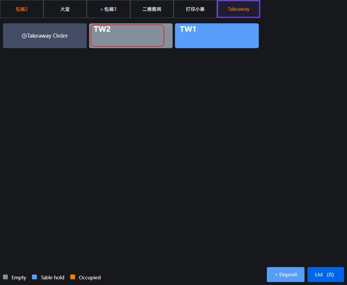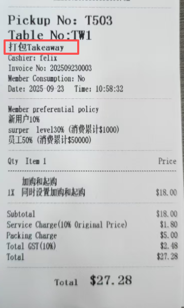 **Orders are placed through the cashier, and the dishes are packaged and ordered 通过收银员进行点单,菜品打包下单** ## Operation process操作流程 ### 一、打包界面下单 Select the dishes that customers need, make notes, discounts (not necessary), and collect payments according to customer needs 选择顾客所需要菜品,进行备注、折扣(非必要),并根据顾客需求进行收款  ### 二、通过堂食进行打包 **适用于需要挂单进行打包带走,或门店内桌台不足,先点单后进行转桌,且收取费用与打包界面下单相同,需要收取打包费(需要在后台开启设置)** #### 1.新增打包桌台 1.在堂食界面,选择‘打包’,点击‘打包订单’ 2.会新增一个虚拟桌台,点击进入点单,与‘堂食’点单相同 3.在支付完成后,这个虚拟桌台会进行保留,会根据后台设置的门店营业时间进行重置删除   ## 小票展示 ### 通过堂食进行打包 小票展示内容和堂食点单小票相同,显示桌台,但显示打包