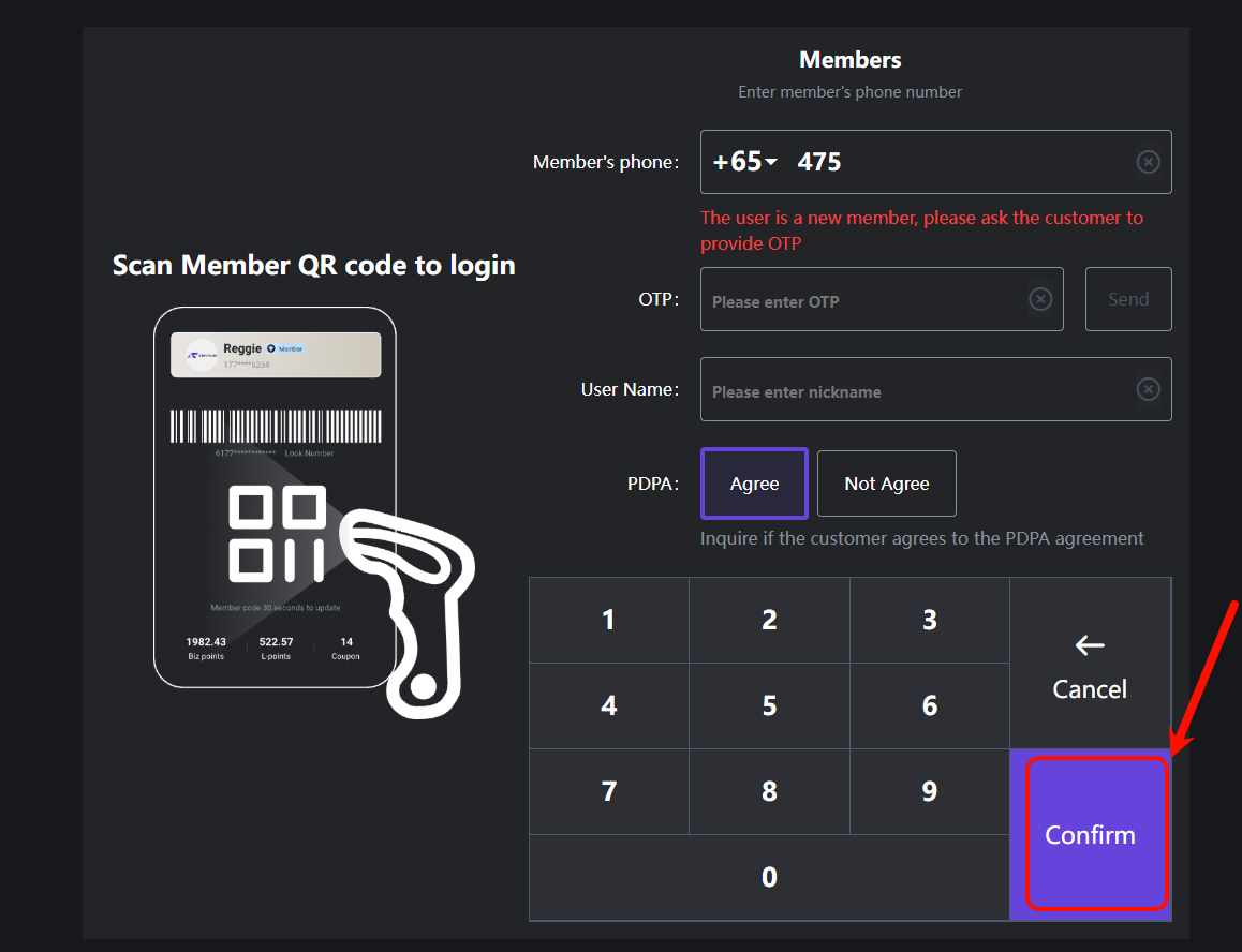 **How to join a non-member and log in to the account to view the order process 非会员如何加入会员、会员登录账号查看订单流程** ## Operation entrance 操作入口 You can log in/register on the member payment page and the member navigation page 会员支付页面以及会员导航页面,都可以登录/注册会员   ## Operation process 操作流程 ### 1.Log in as a member 登录会员 Scan the membership code to log in/enter the member's mobile phone number to log in (click on the country code at the beginning to change/add the area code, starting with the mobile phone number) 扫描会员码登录/输入会员手机号登录(点击开头国家区号,可以进行更换/新增区号,手机号开头)  ### 2.Register as a member 注册会员 On the login interface, enter the mobile phone number of the registered member, provide the verification code sent to the mobile phone number, the member's nickname, and agree to the PDPA agreement as required, and click 'Confirm' to successfully create a member 在登录界面,输入注册会员的手机号,按照需求提供发送至手机号的验证码,会员昵称,以及同意PDPA协议,点击‘确认’会员创建成功